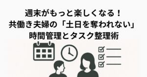 平日の「ちょい家事」で負担を減らし、週末の「集中家事タイム」で一気に片付け、残りはリフレッシュやデートに。この仕組みで、あなたたち夫婦の週末を「自分たちの時間」に取り戻しましょう!