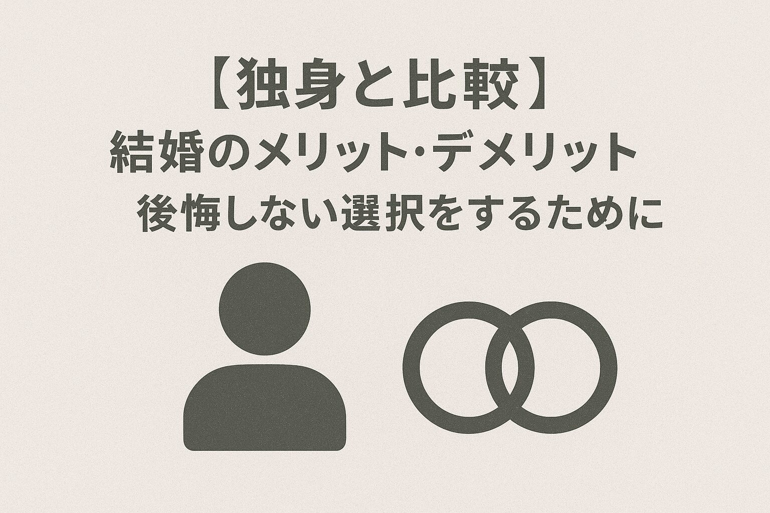 結婚は、メリットとデメリットの**「どちらが優れているか」ではなく、「自分にとって何が最も大切か」**によって判断すべきものです。以下の点を自問自答してみましょう。 質問 独身(自由・自立)のメリットが上回る場合 結婚(安心・共有)のメリットが上回る場合