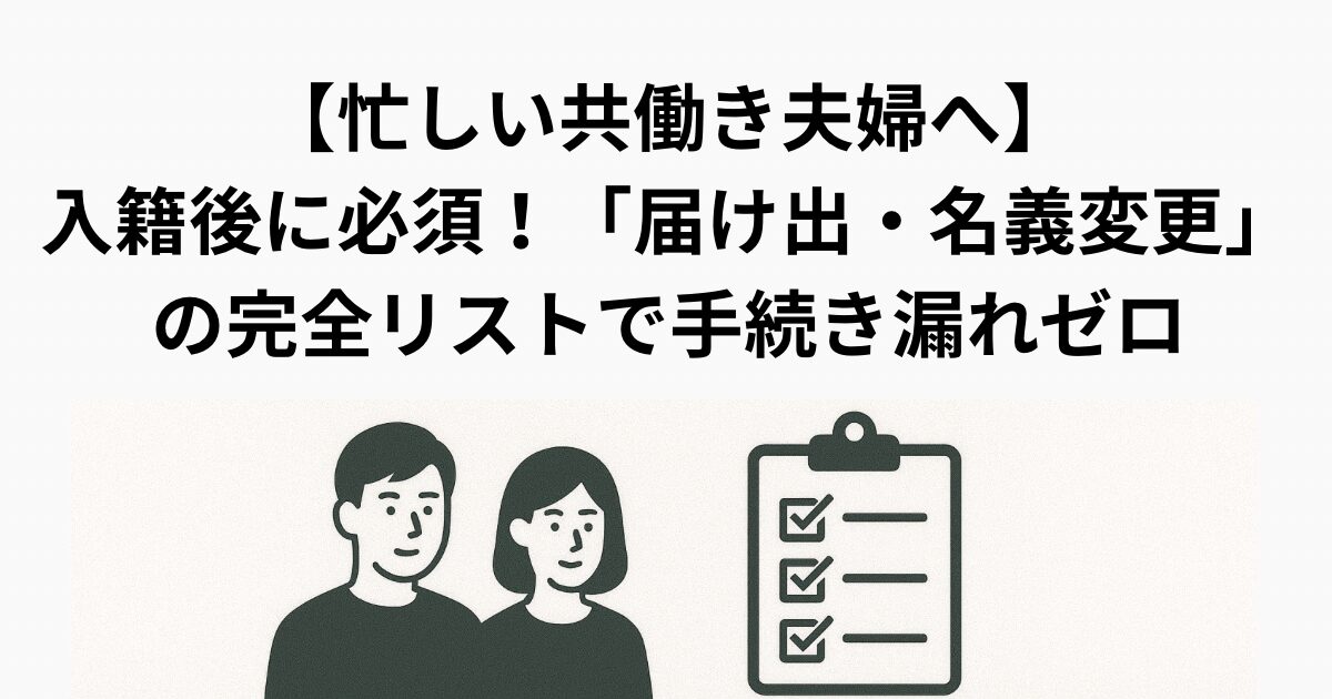 入籍後の新生活はワクワクする一方で、役所や銀行、保険会社での名義変更や届け出の山に直面しがち。忙しい共働き夫婦にとって、これらの手続きは時間とエネルギーを奪うストレス要因です。